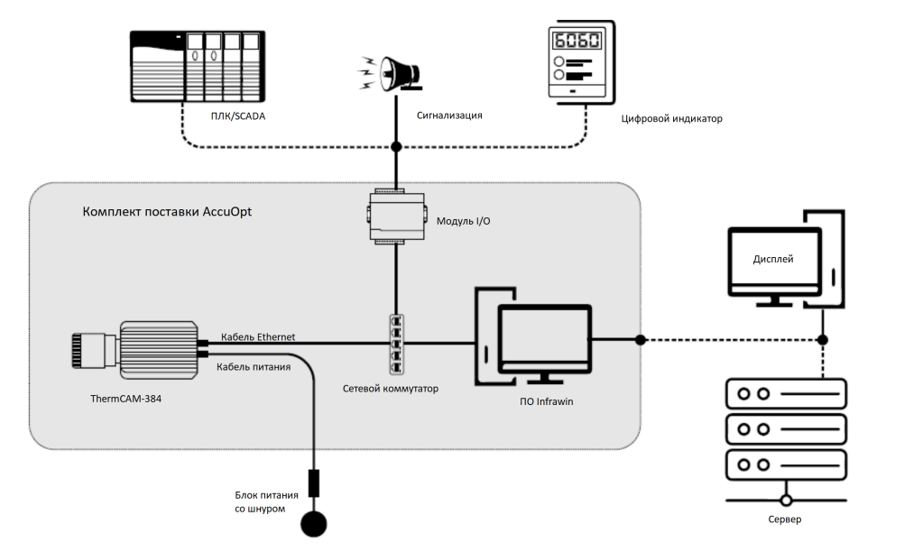 • Информация также может быть передана через ПЛК/SCADA, цифровые индикаторы, сигнализация и т. д. При помощи модуля ввода-вывода (I/O) через сетевой коммутатор.